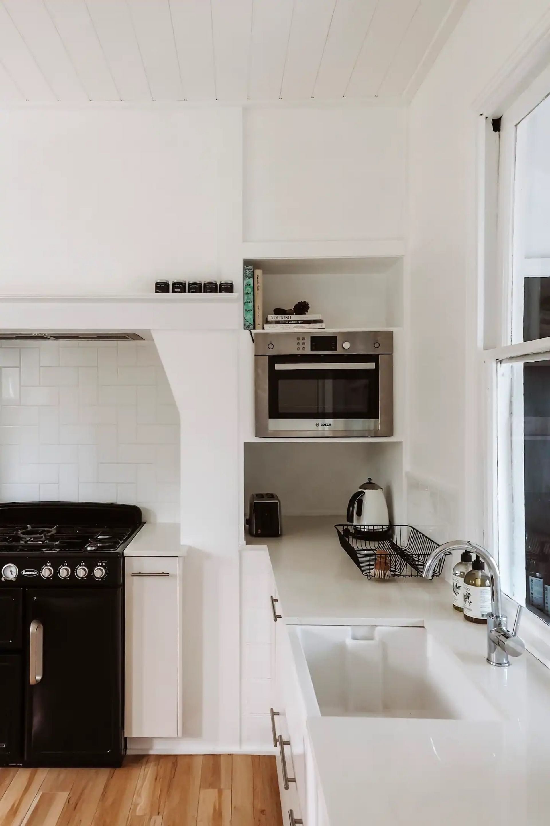 Country style kitchen featuring Caesarstone countertops and ample cabinet space.