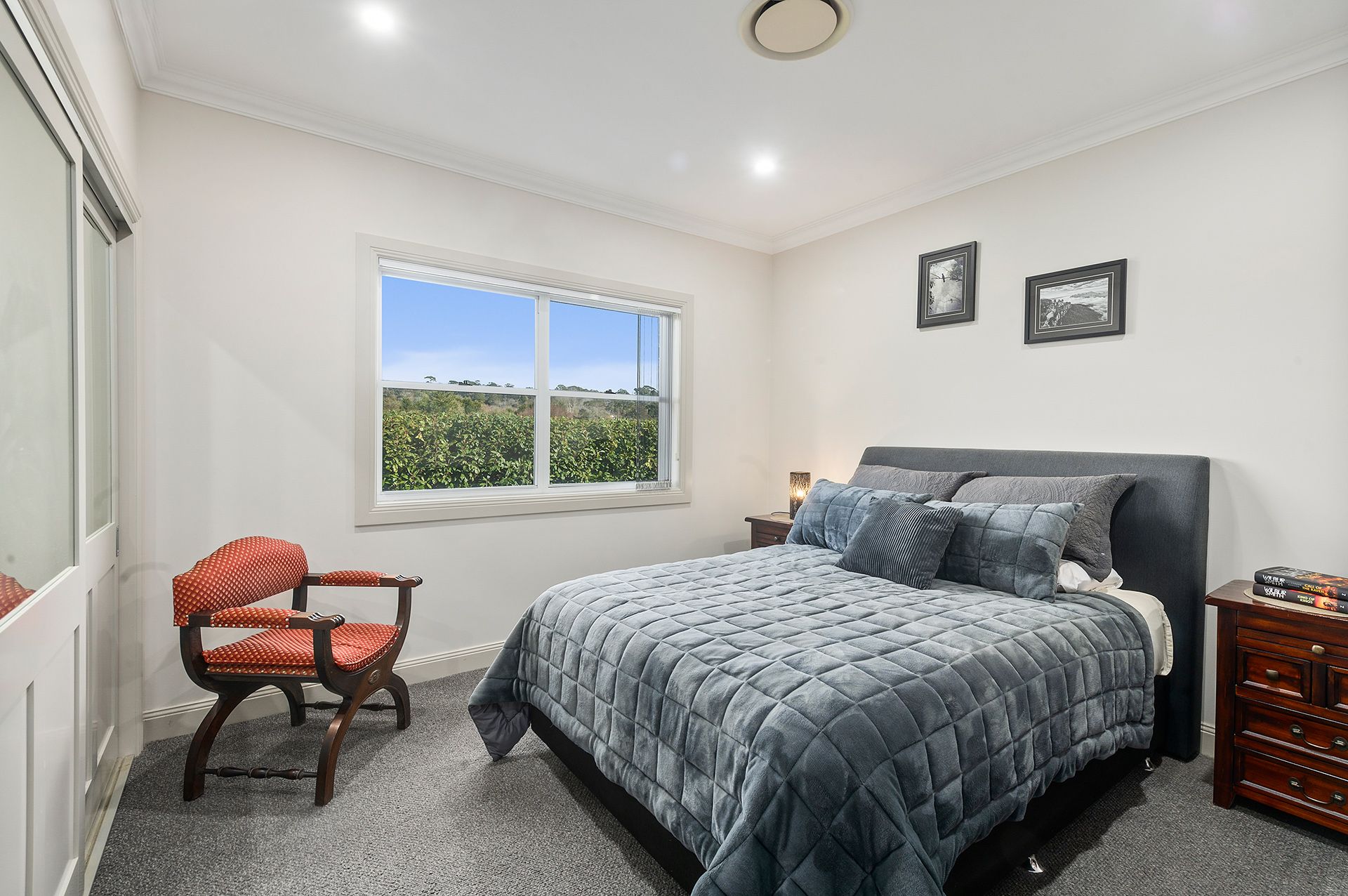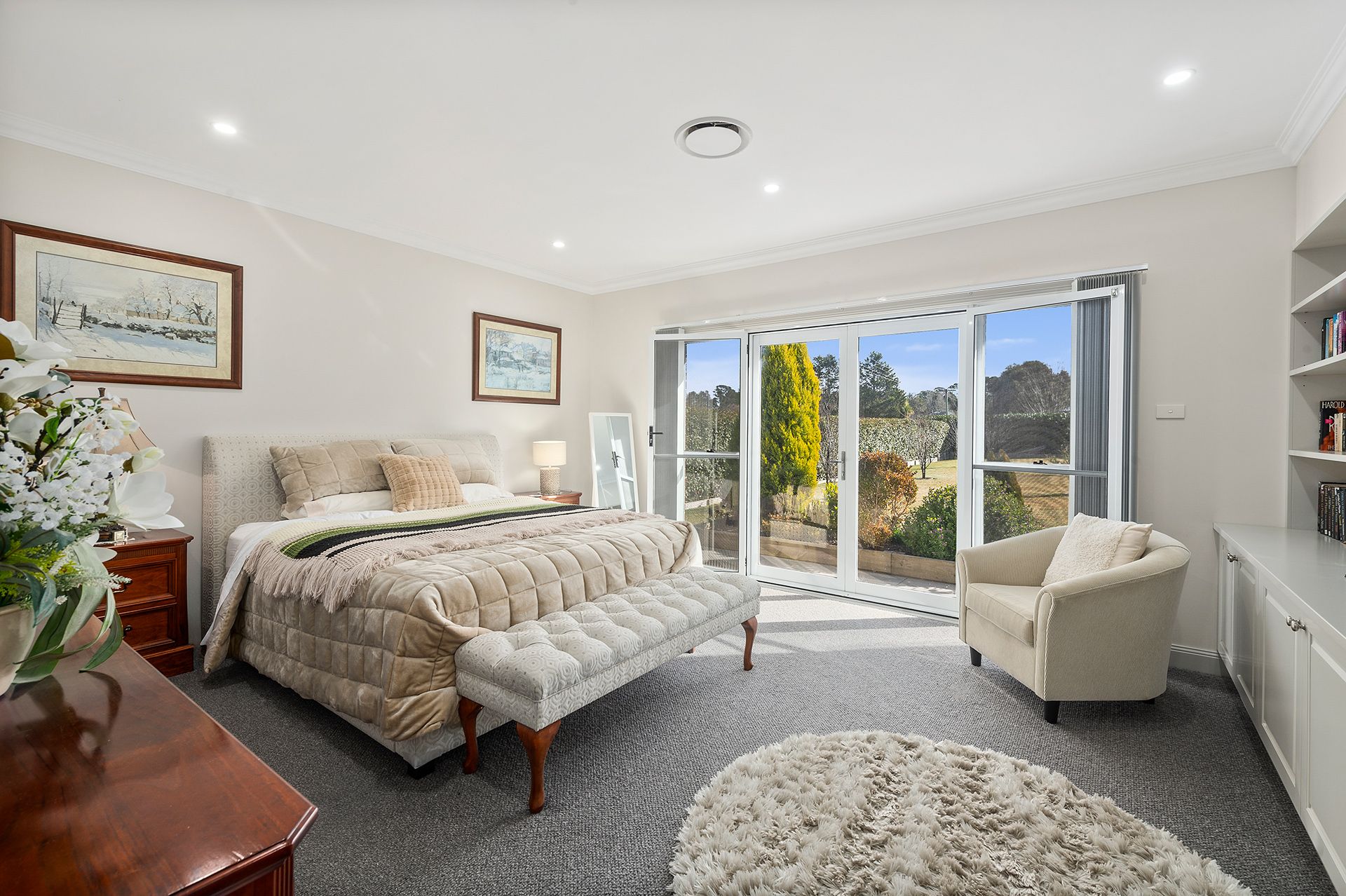 – The king-sized master bedroom is a true sanctuary, featuring a walk-in robe, built-in cabinetry and bookshelves, French doors, and a stylish ensuite.