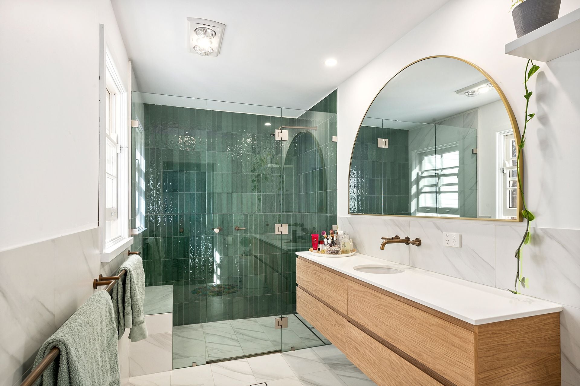 Upstairs, the private master retreat is a true sanctuary, complete with a walk-through wardrobe offering ample hanging and shelving space, and stunning views across Mount Alexandra. The adjoining ensuite is a standout, featuring dramatic green tiled shower walls, a substantial timber vanity, and rustic aged-bronze tapware.