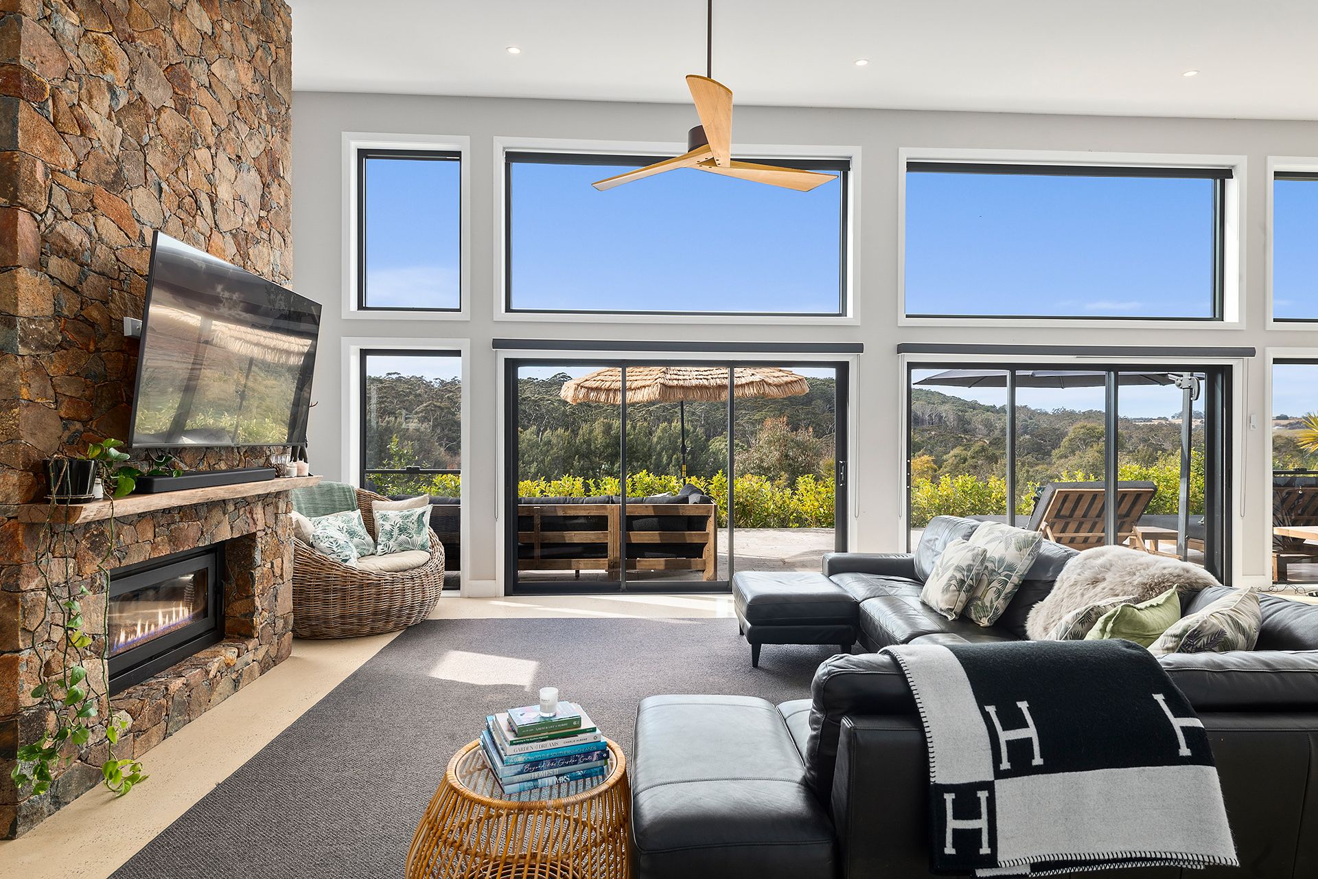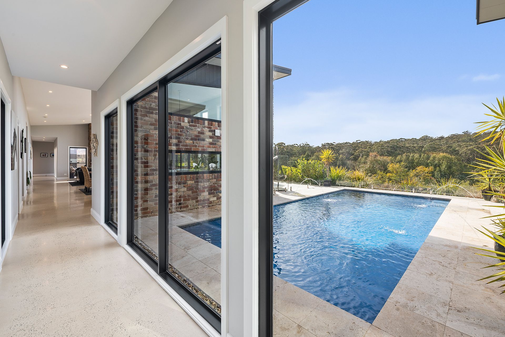 At the centre, an expansive open-plan living zone is crowned by soaring skillion ceilings, polished concrete floors, and a Jetmaster fireplace, perfectly balancing form and function. Expansive windows capture uninterrupted views and flood the interiors with natural light, while seamless connections to alfresco areas, a heated saltwater pool, and native gardens make the home equally ideal for entertaining and everyday living.