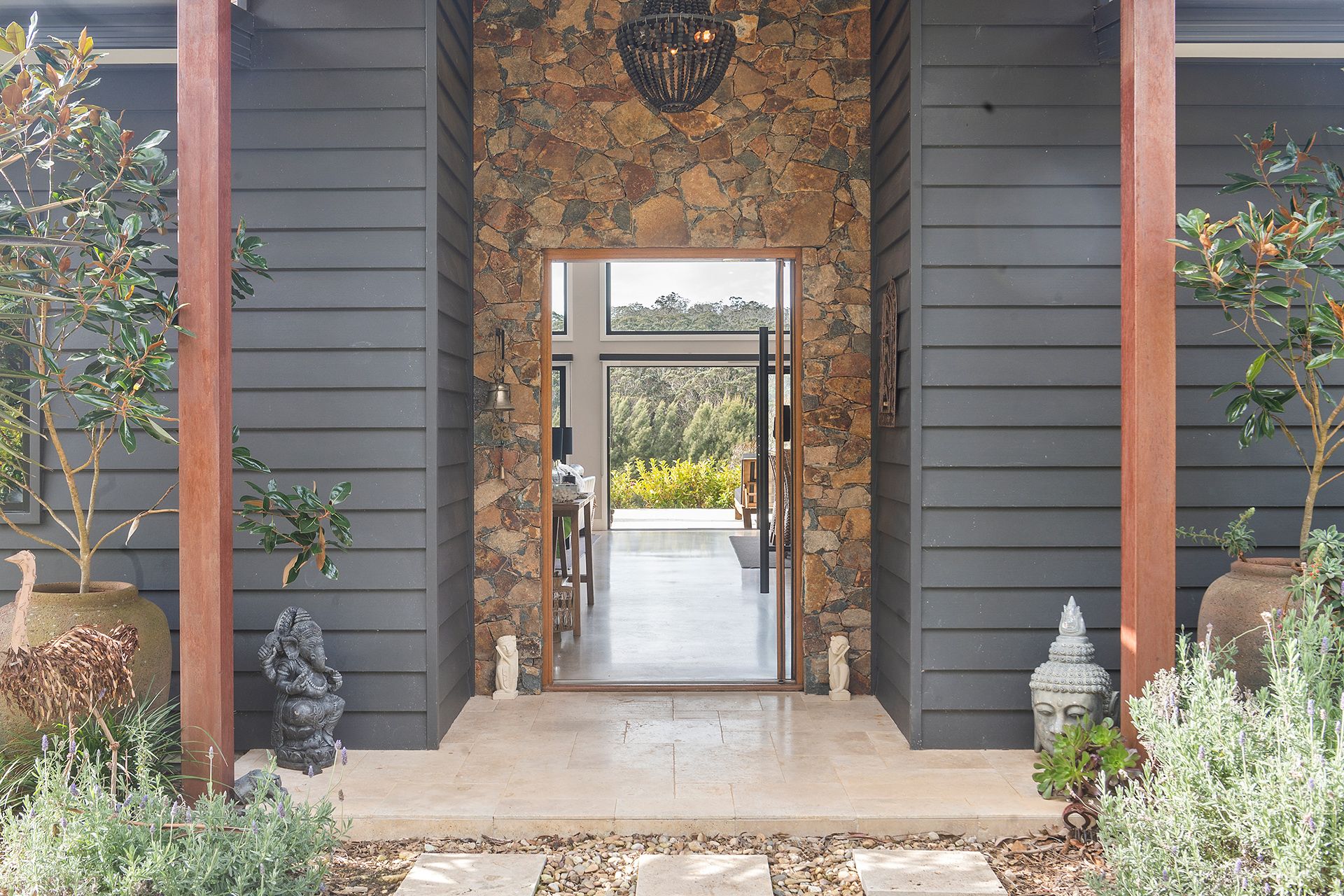 The home unfolds across three beautifully connected pavilions, joined by glass linkways, spanning over 600 sqm of indoor and outdoor living space. From the moment you enter through the hand-laid dry stone front wall and landscaped grounds, you’re met with impeccable attention to detail, natural materials, and a sense of space and calm that is rarely found.