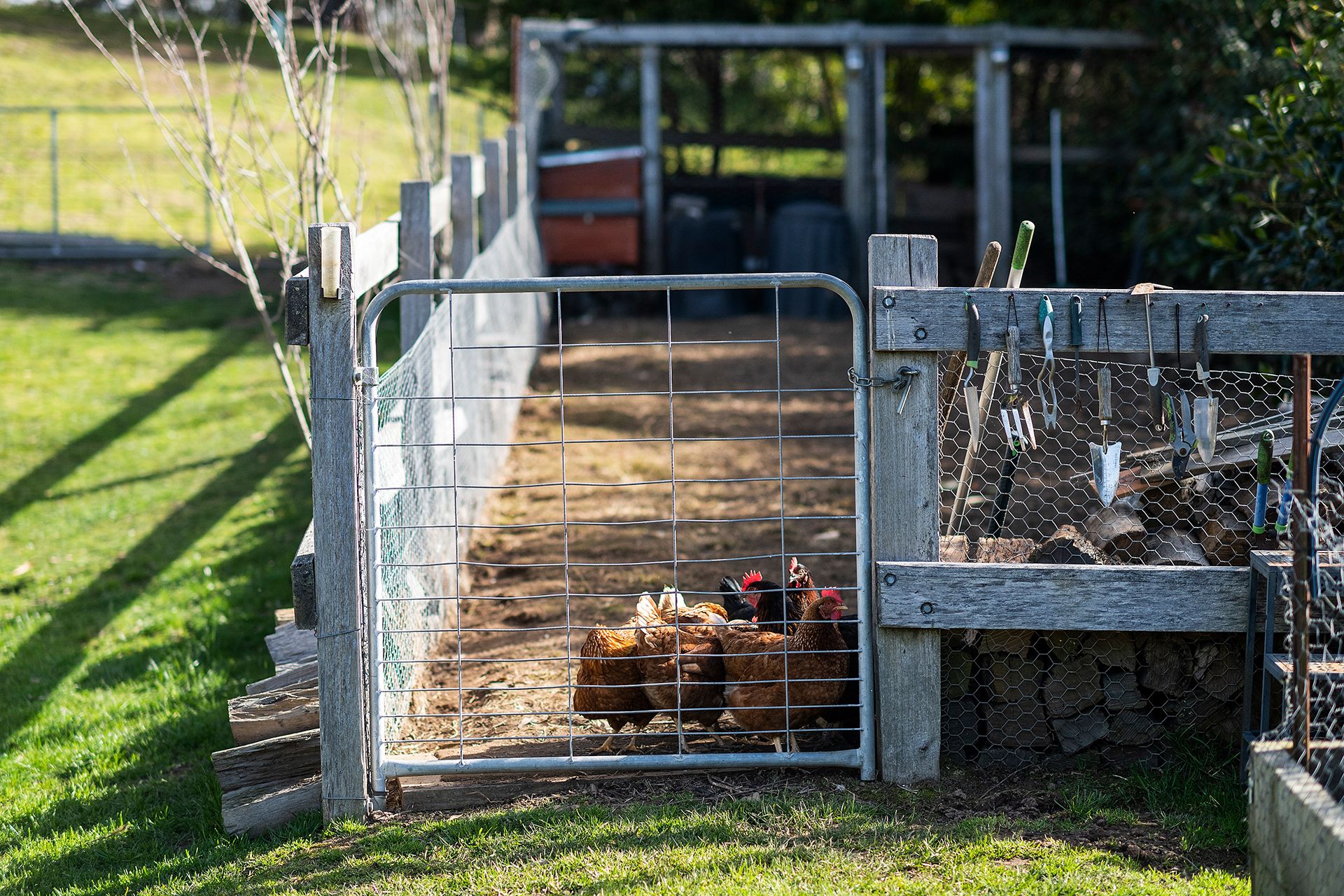 – Raised vegetable beds, flourishing fruit trees, and a fully fenced chicken run and dog yard