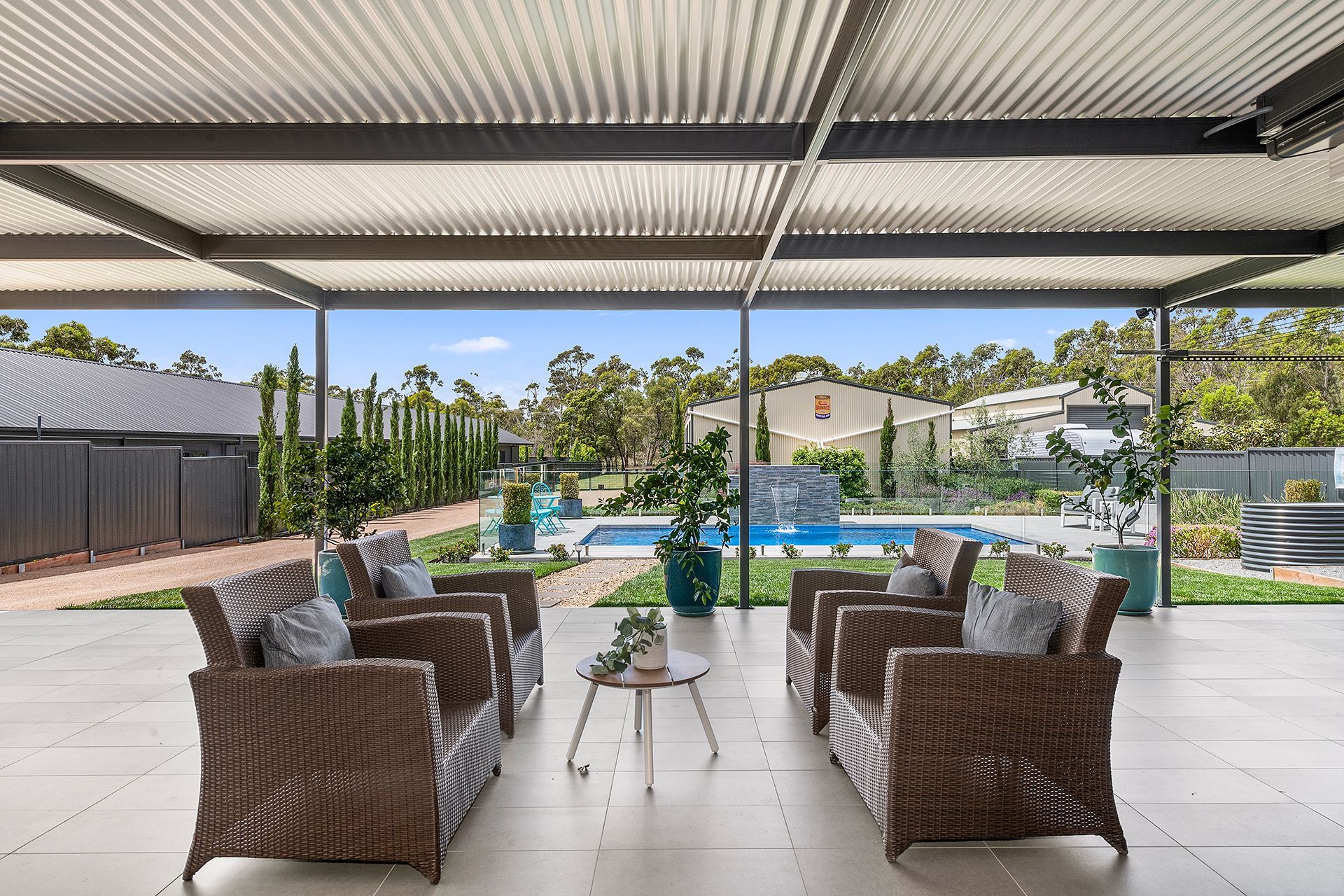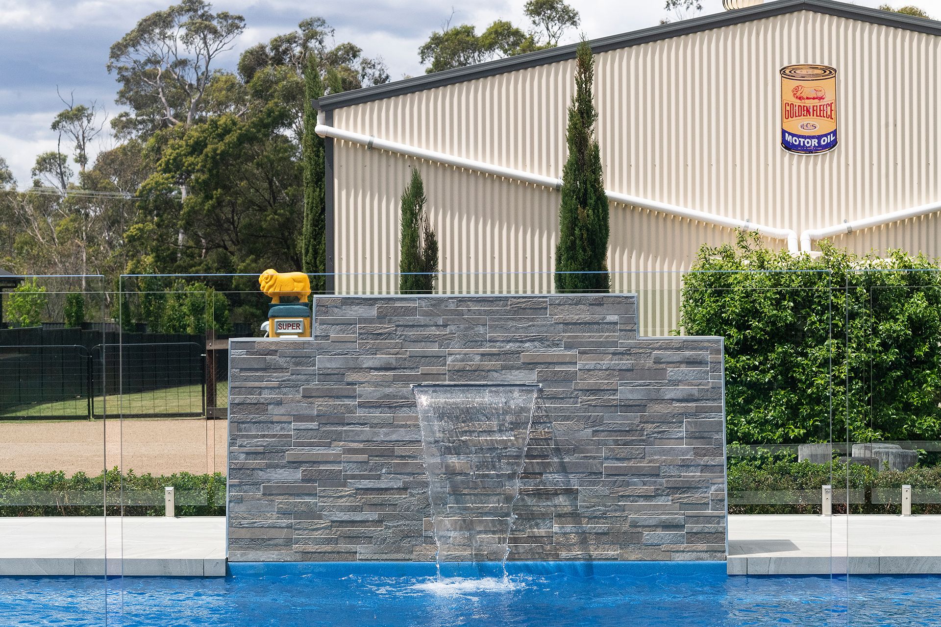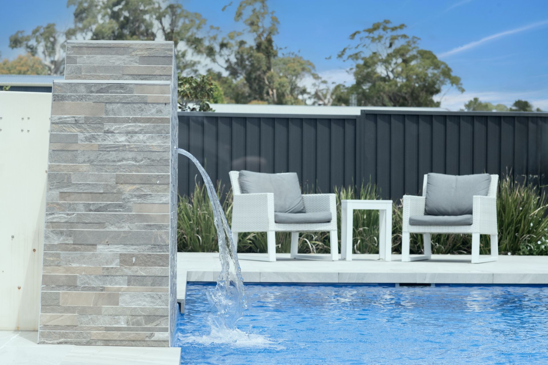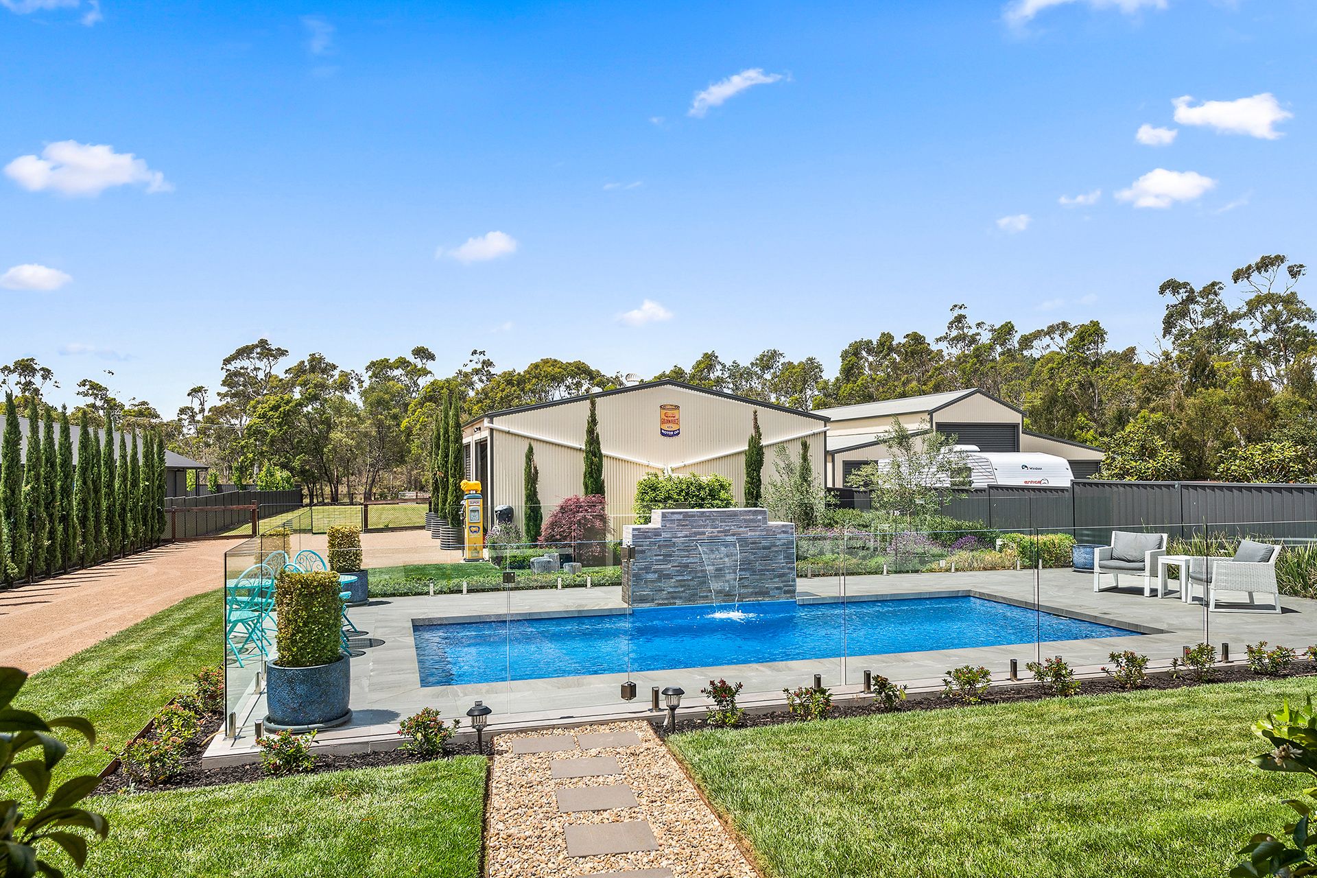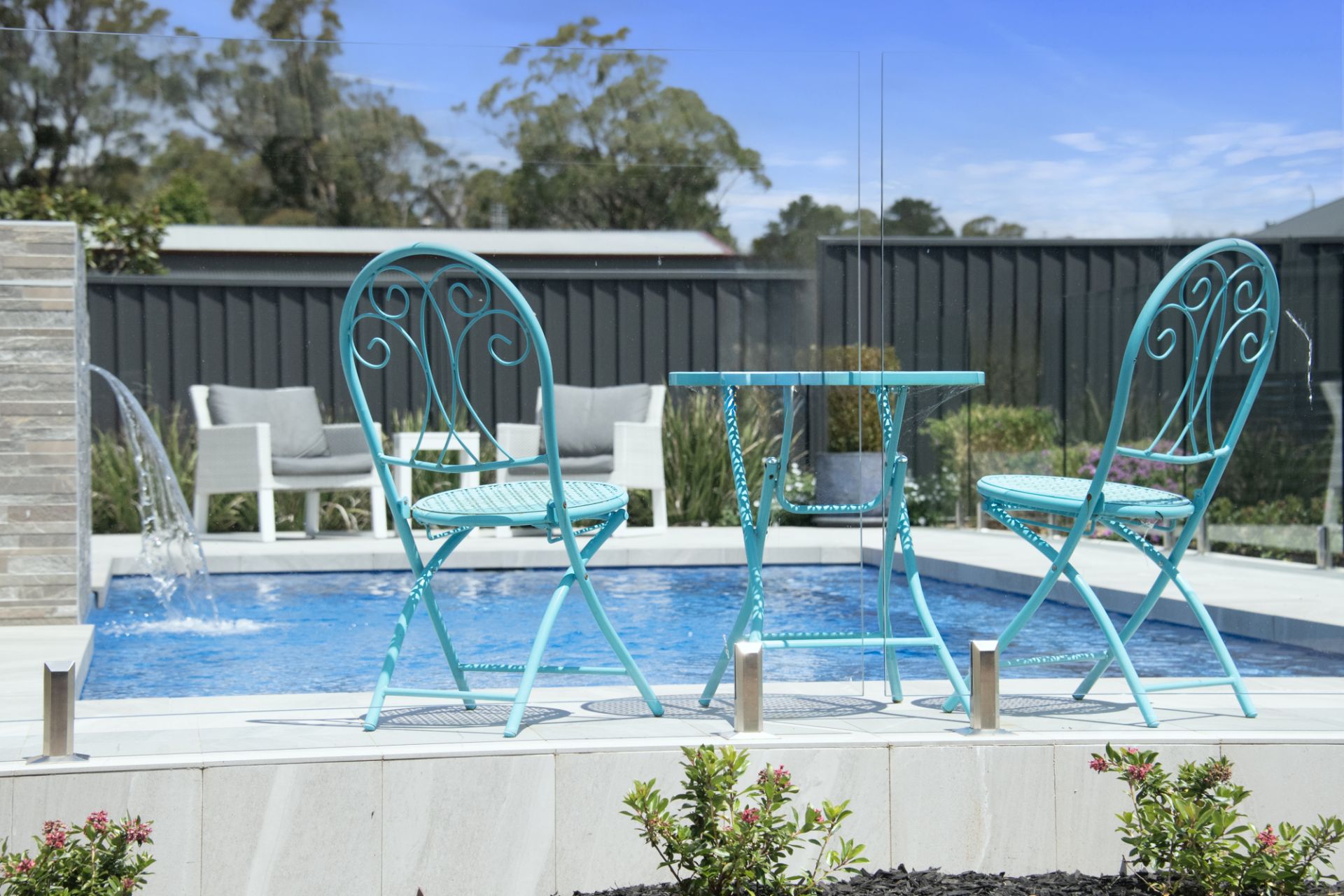 – Heated Salt water chlorinated swimming pool with water feature and glass fencing