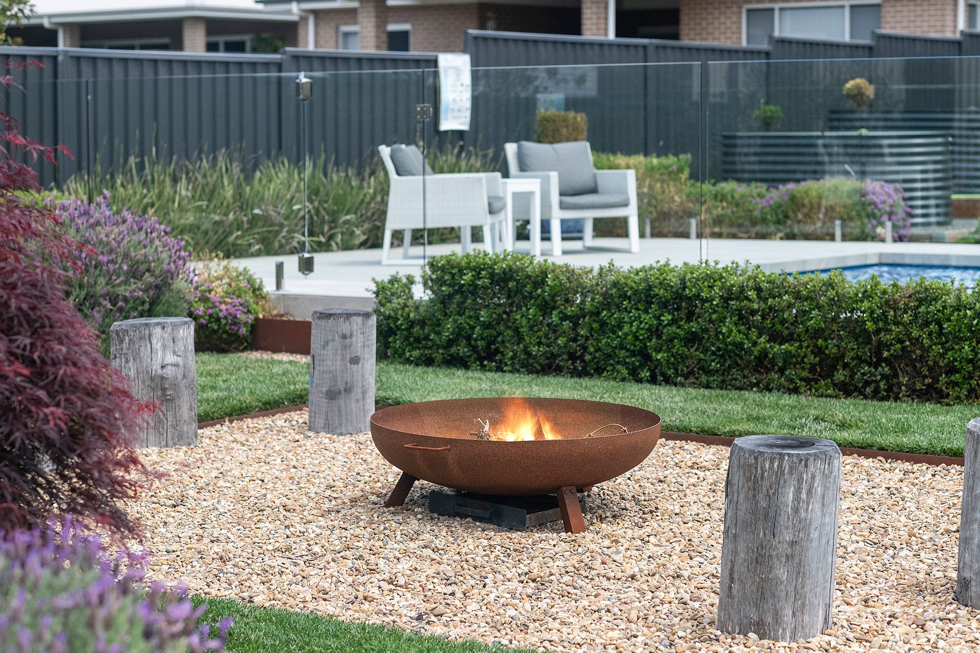 – Picturesque firepit with rustic seating