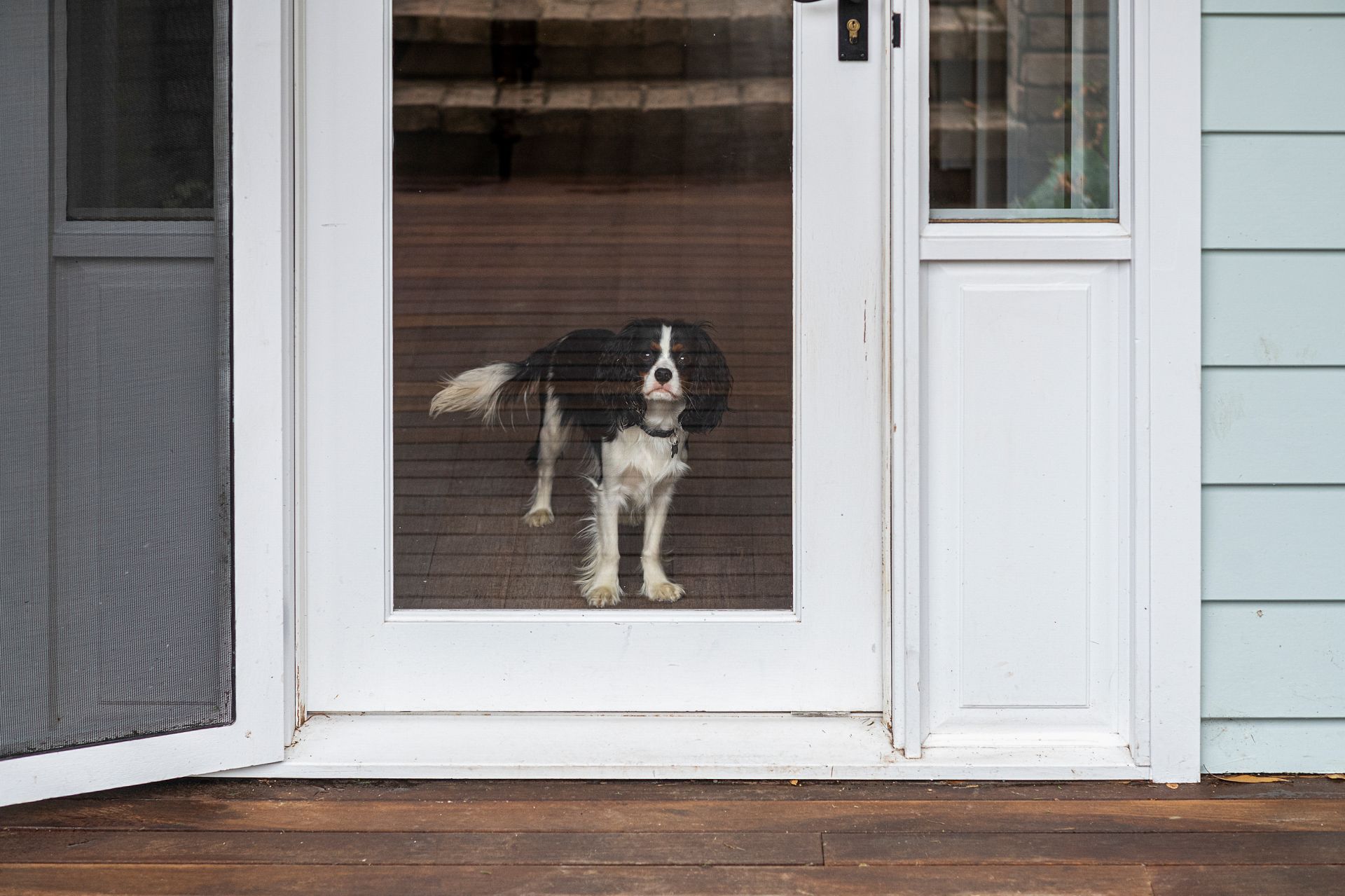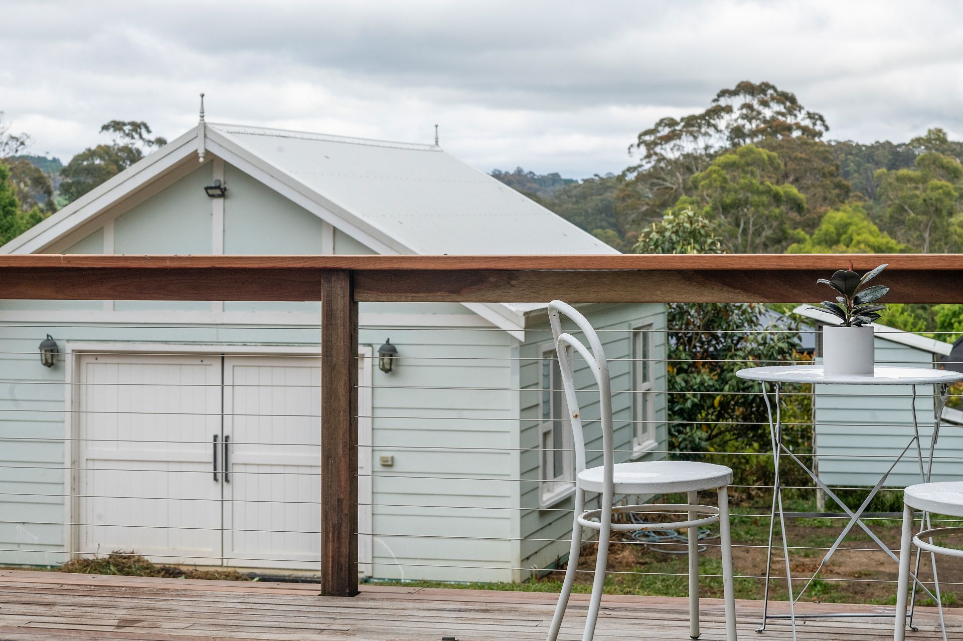 – French doors opening to a wrap-around timber deck with peaceful, scenic views