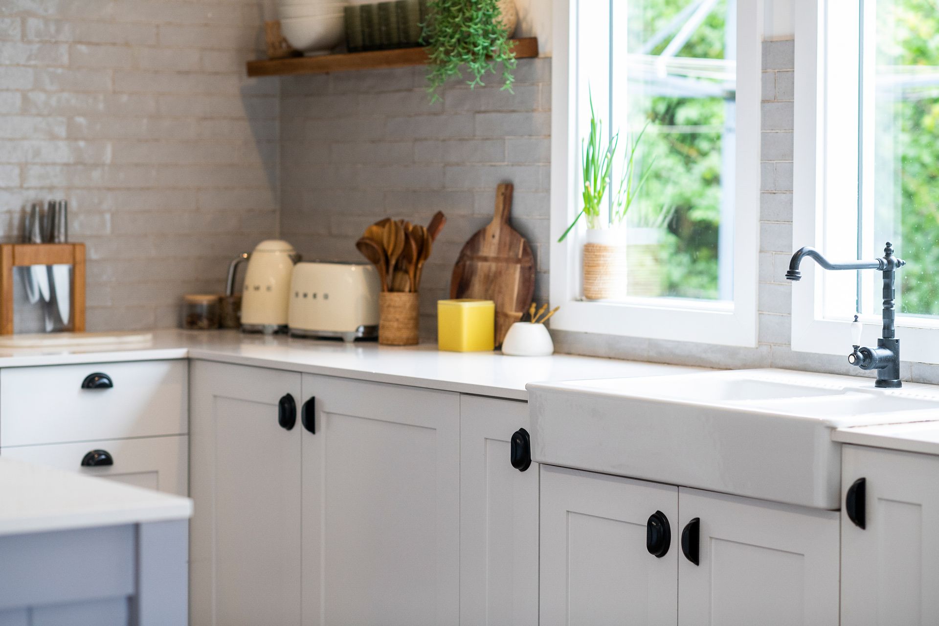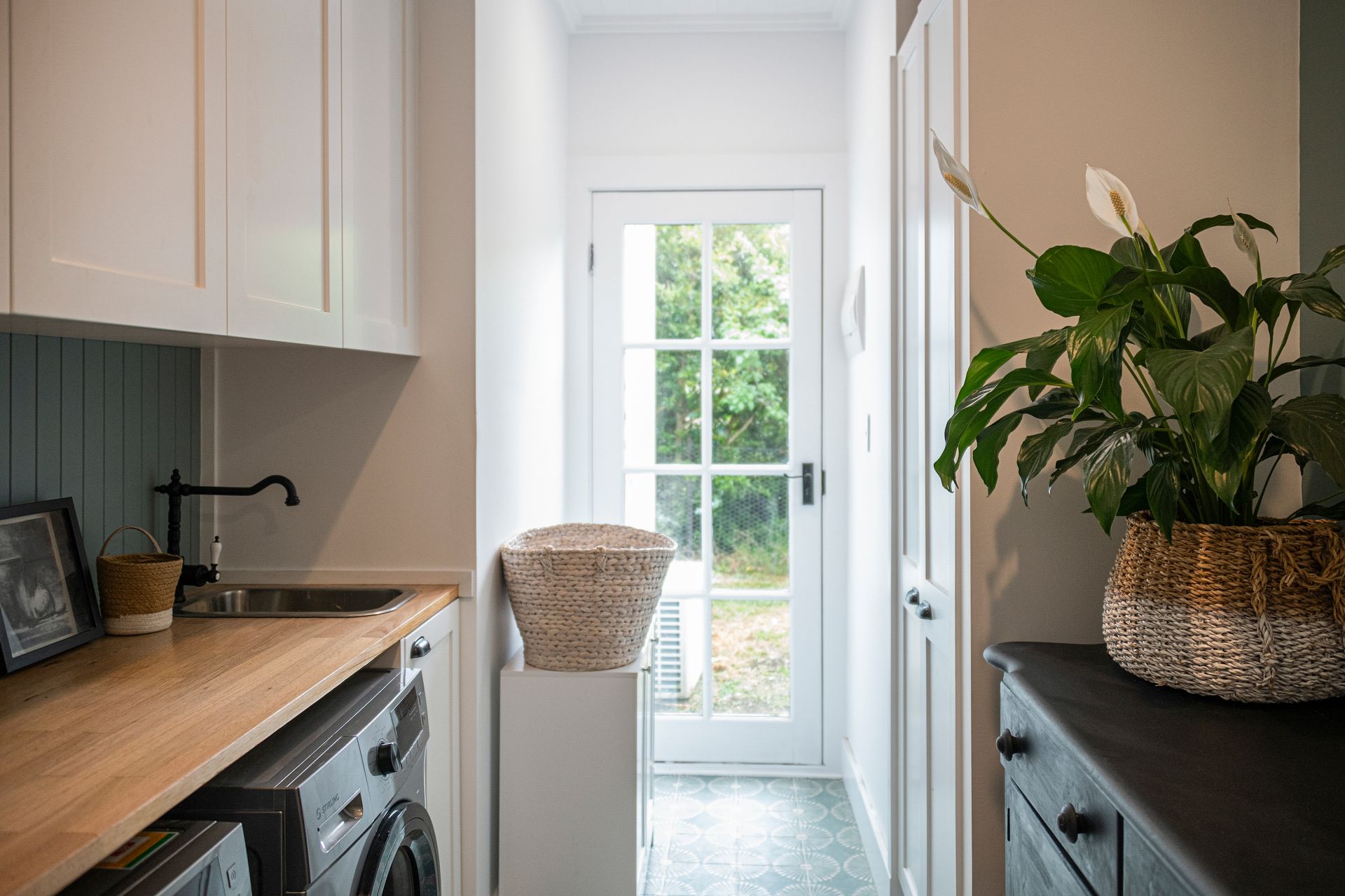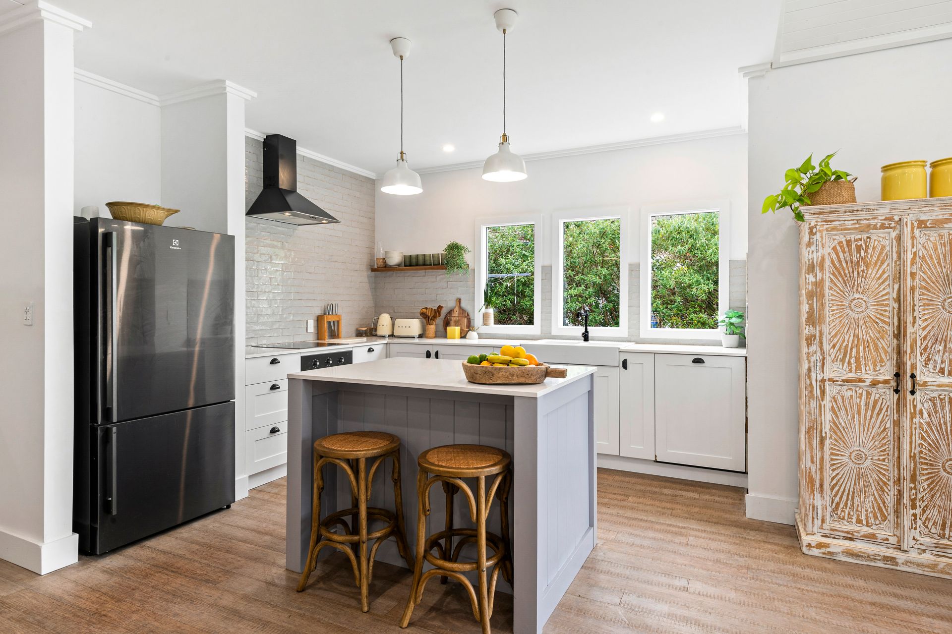 – Designer kitchen featuring high-end appliances, including an induction cooktop, a Caesarstone island with pendant lighting, triple windows over the double sink, custom tiled splashback with built-in timber spice shelves, and excellent storage and bench space.