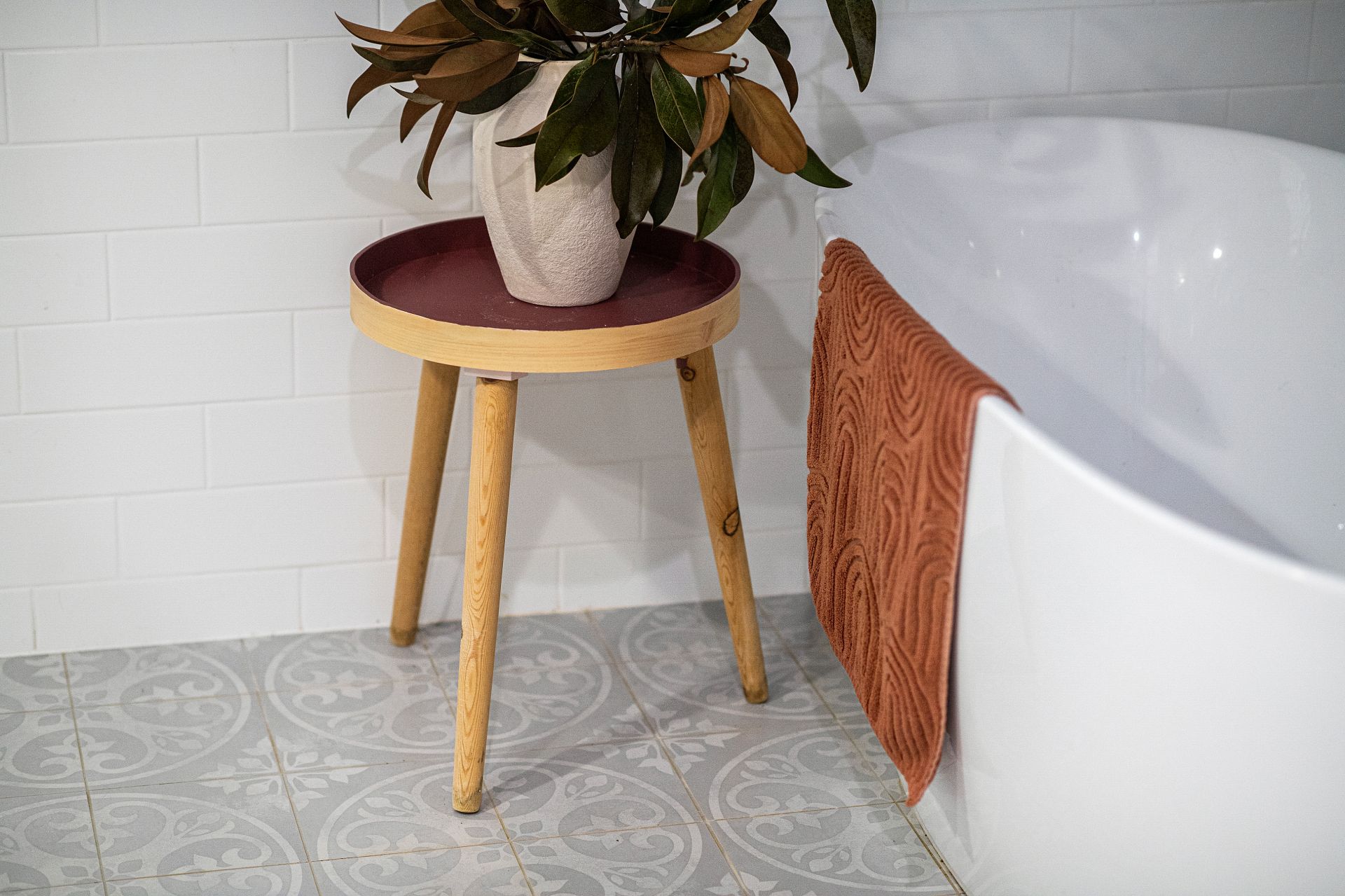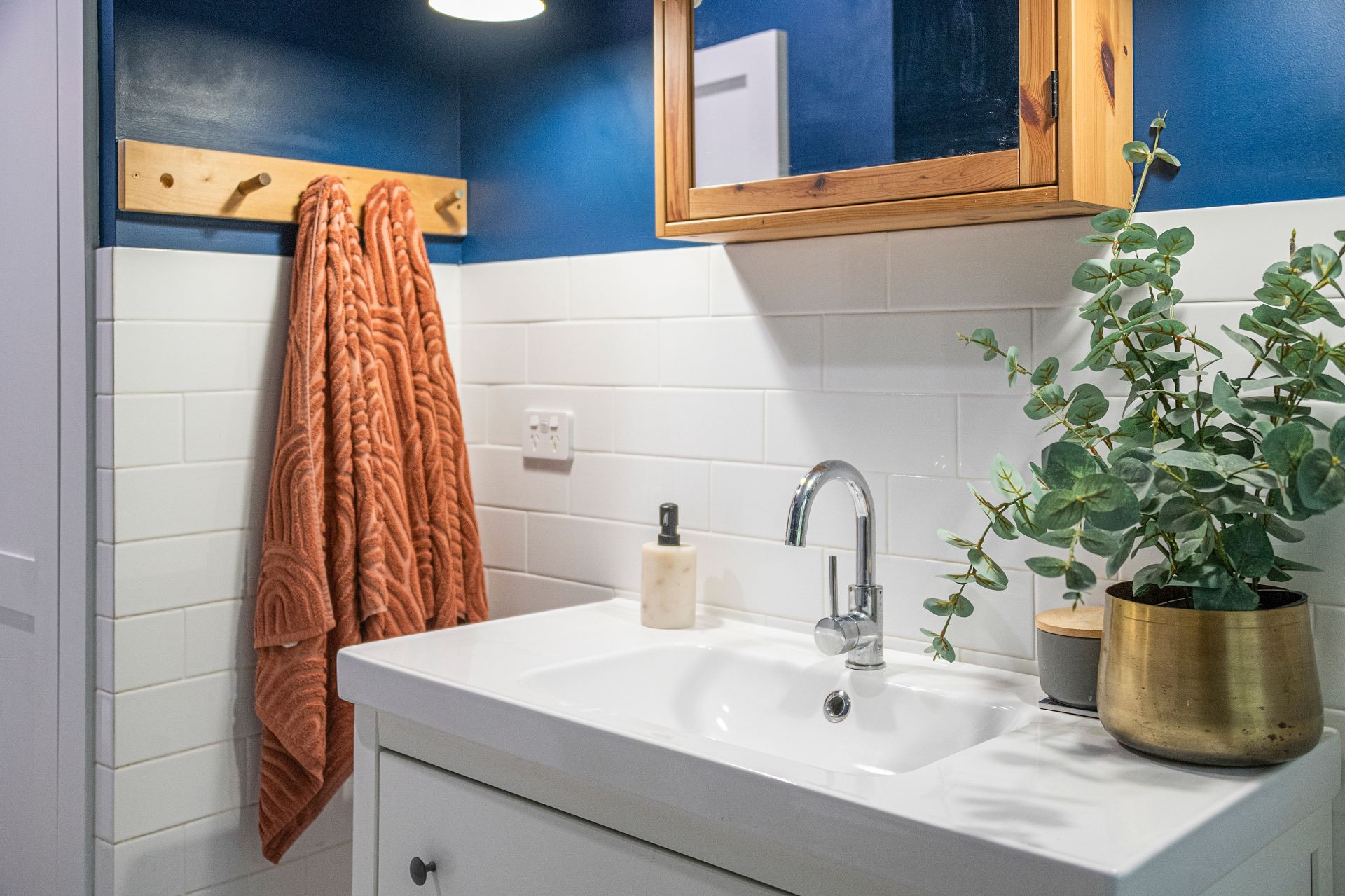 – Central bathroom featuring a hidden shower, bath, vanity, WC, and ample storage
