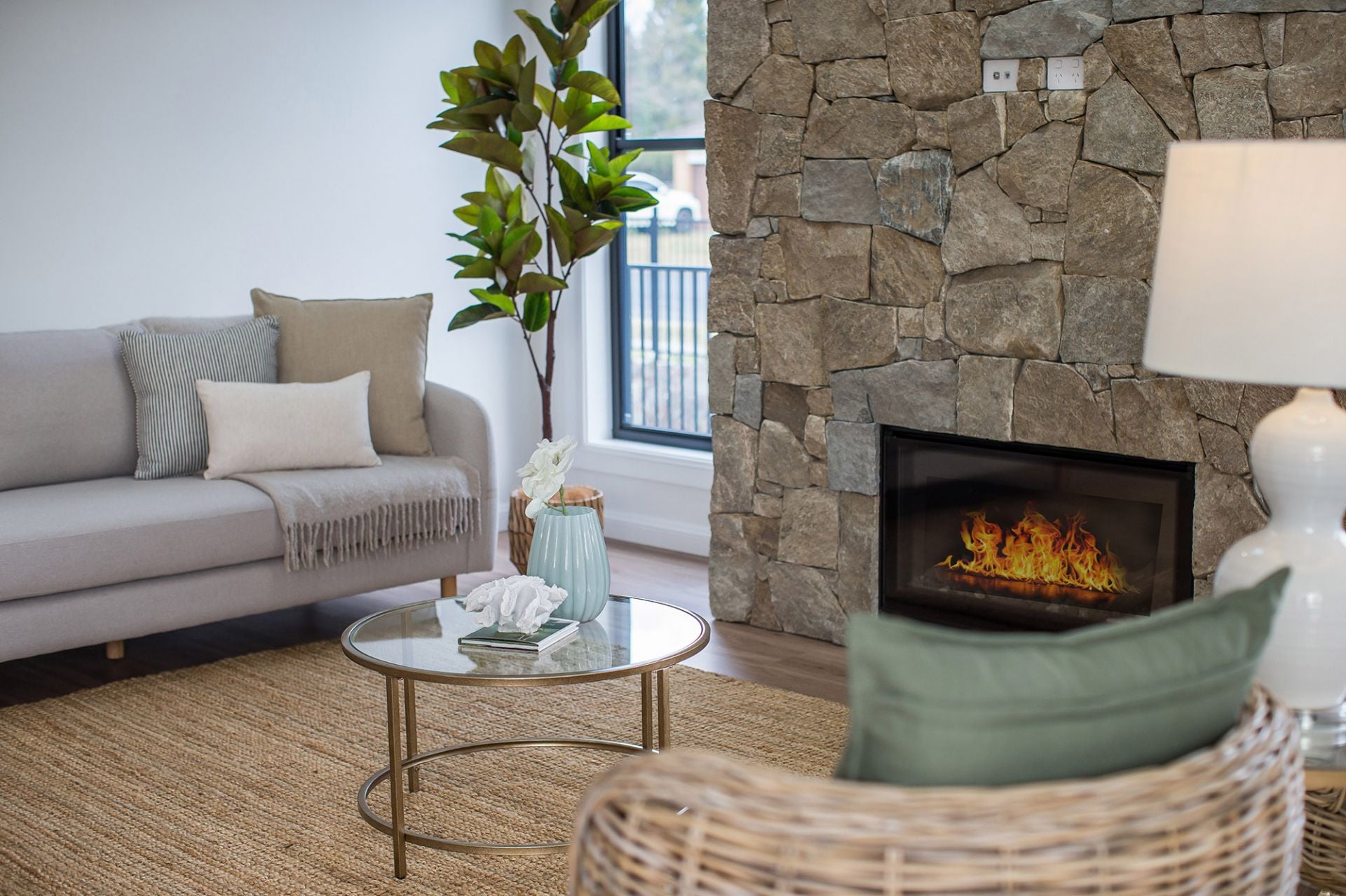– Striking stone fireplace sets a warm, elegant tone in the open-plan living area