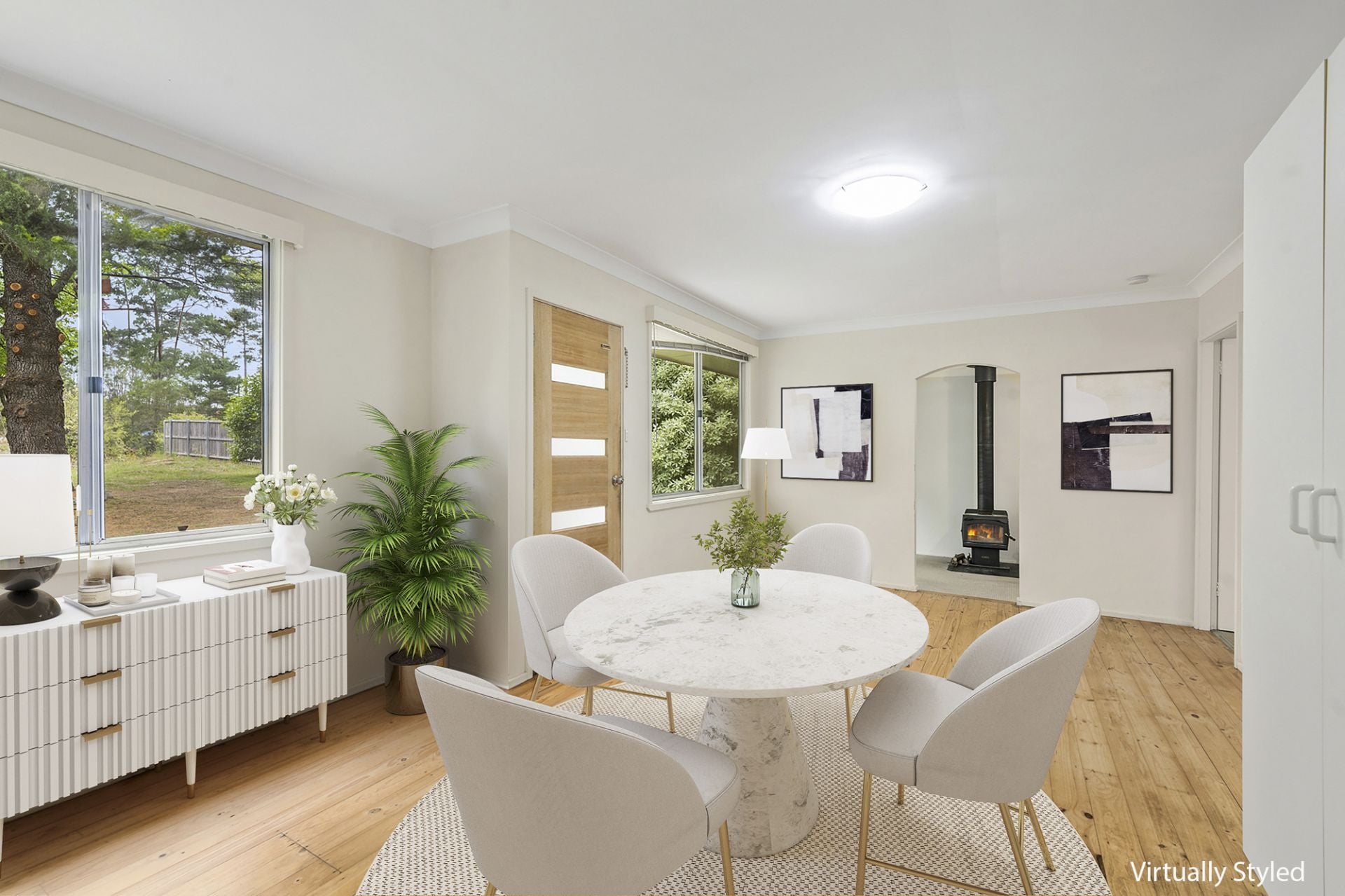 Neat, comfortable, and move-in ready, the home features timber floorboards that enhance its warm country appeal. A light-filled living area welcomes you inside, while the open-plan kitchen and dining space provides a practical and inviting space for daily living. Large picture windows frame leafy garden outlooks, bringing the outdoors in and filling the home with natural light.