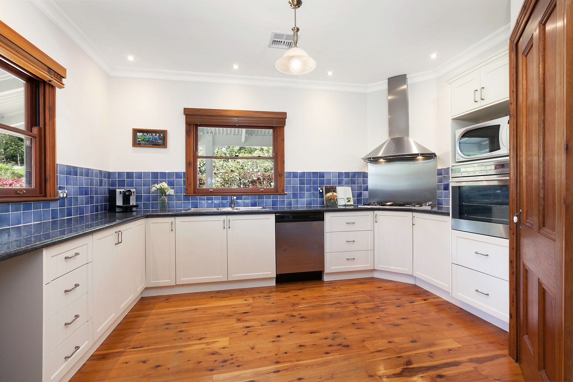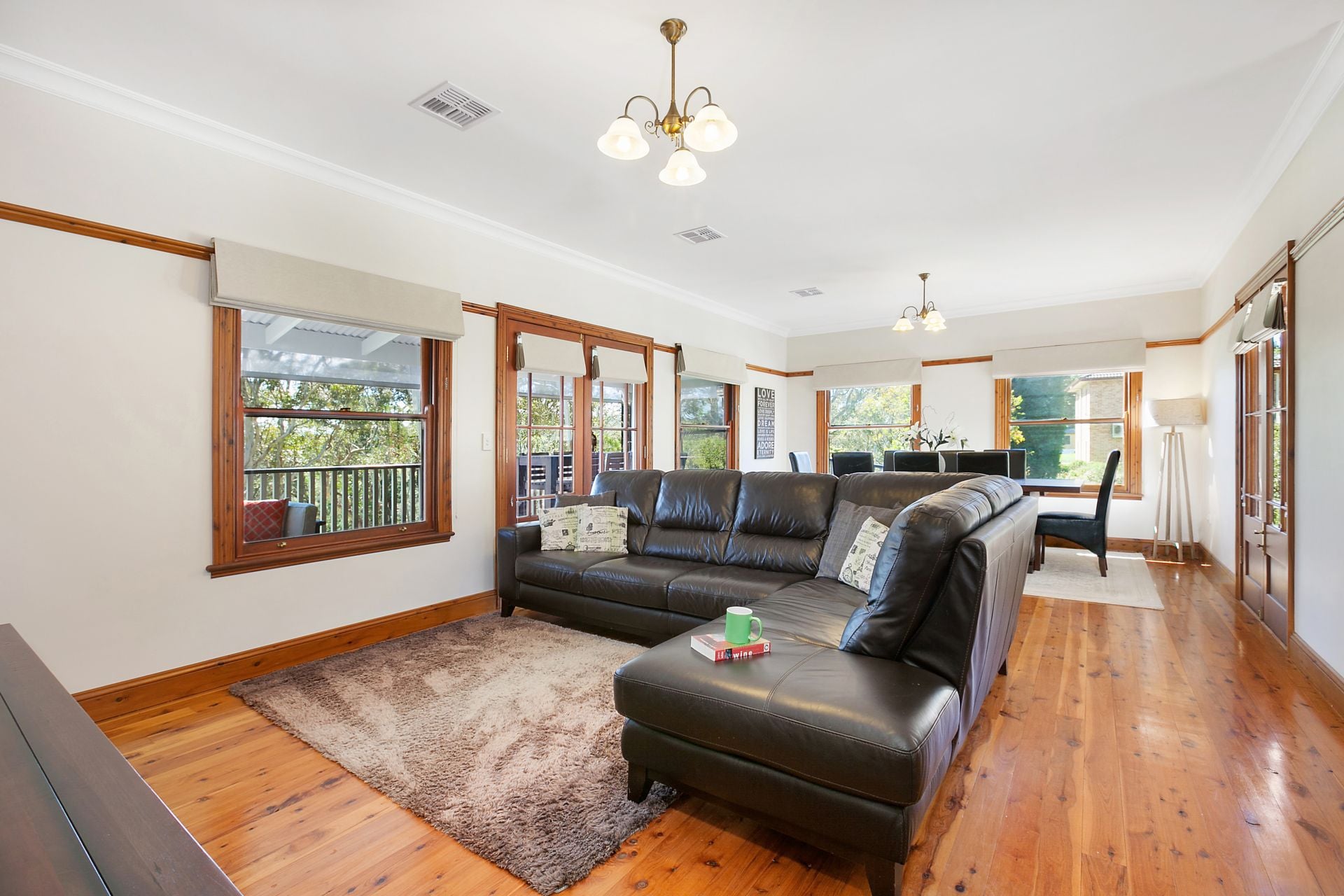Timber-framed doors and windows and polished timber flooring throughout create a warm, timeless country feel. Light-filled interiors enhance the home’s inviting atmosphere. The single-level layout is generous and practical, with multiple living zones designed for relaxed family living and easy indoor–outdoor flow.