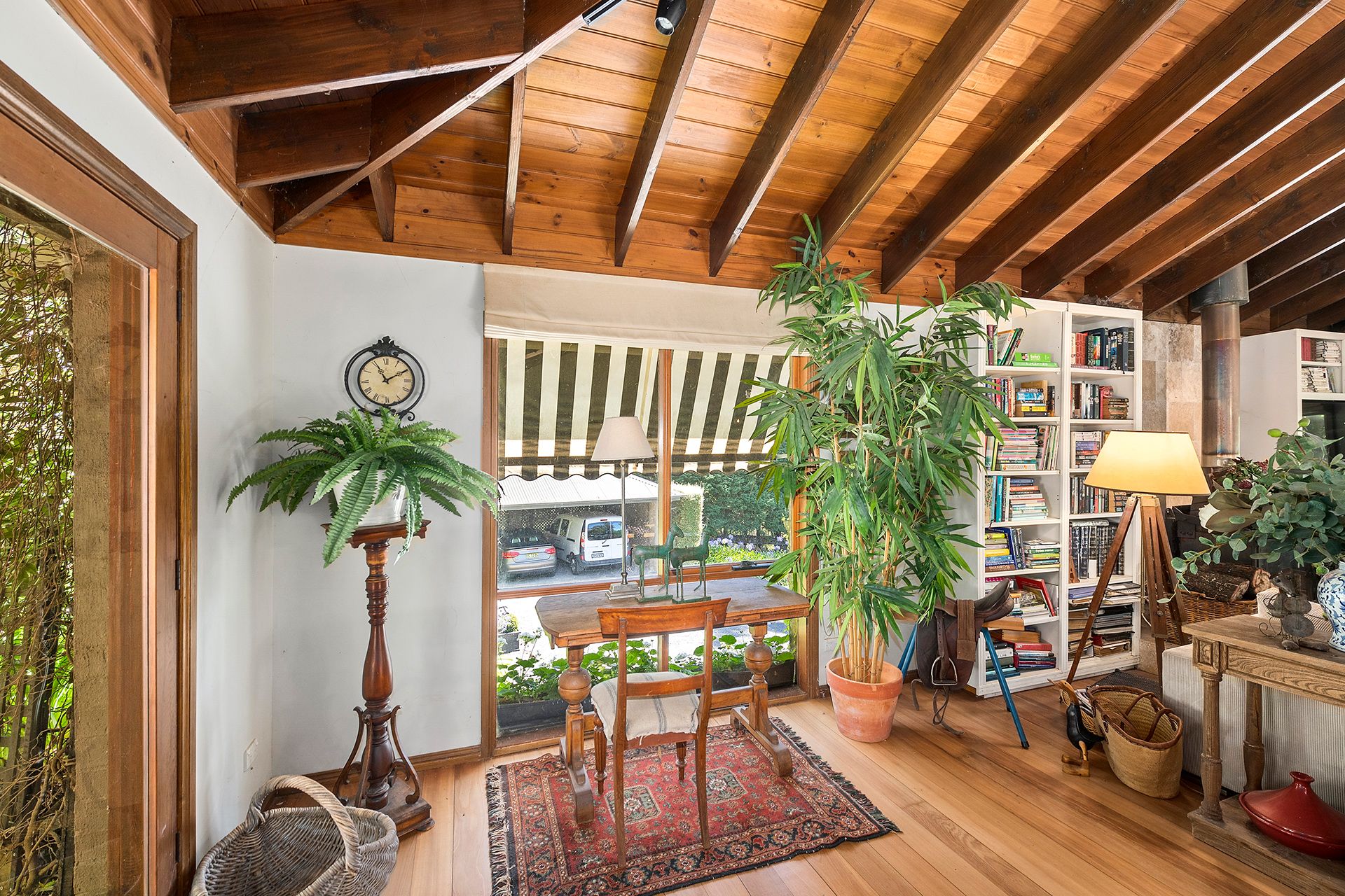 Step inside and be welcomed by a spacious open-plan living, dining and kitchen area featuring vaulted timber-lined ceilings, skylights and rich solid timber flooring. The character kitchen brings classic country warmth with a 5-burner gas freestanding stove, electric oven and pantry, while the Chemise French slow-combustion fire provides cosy winter ambience. Reverse-cycle air conditioning, ceiling fans and gas connections ensure year-round comfort.
