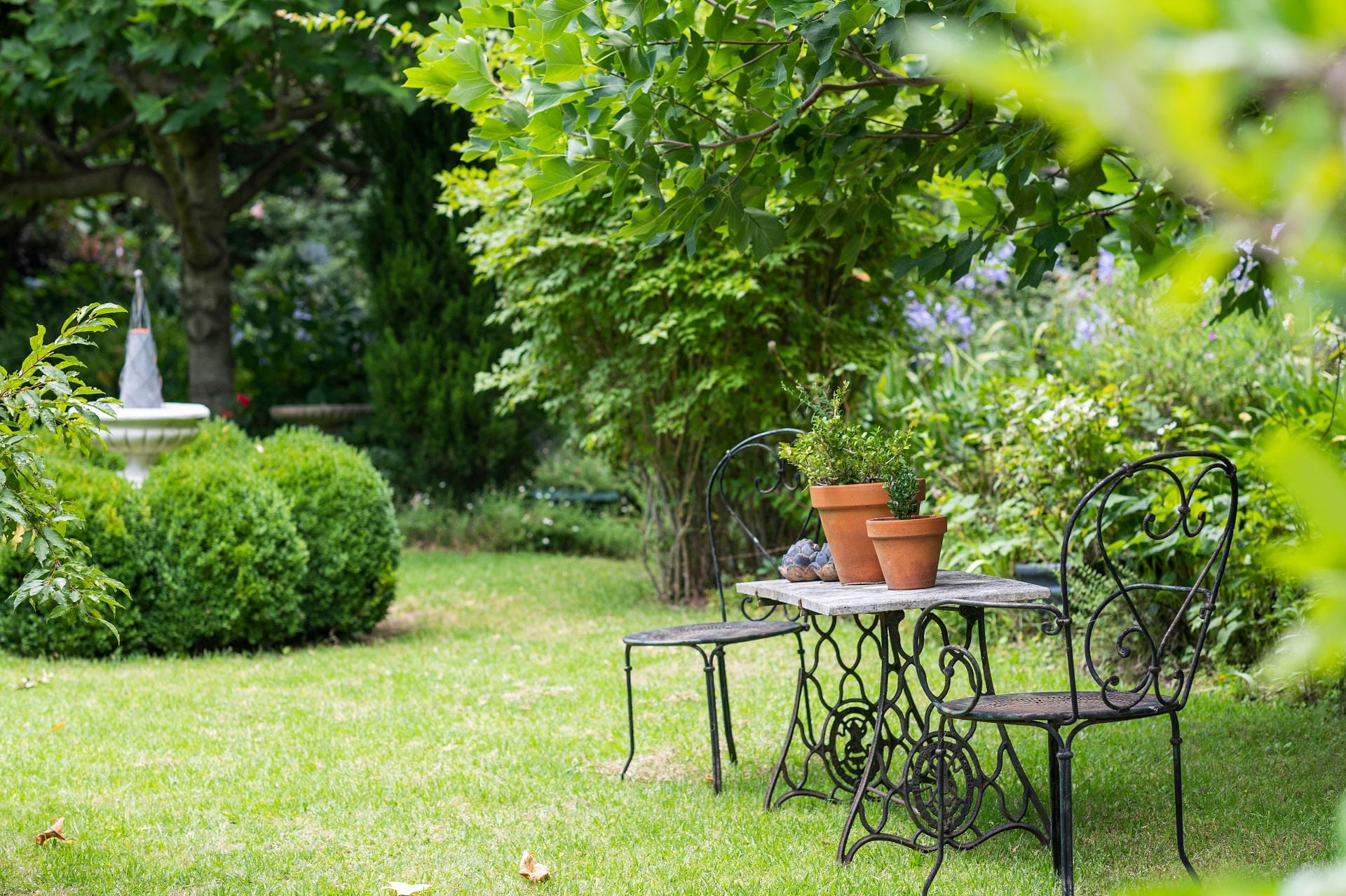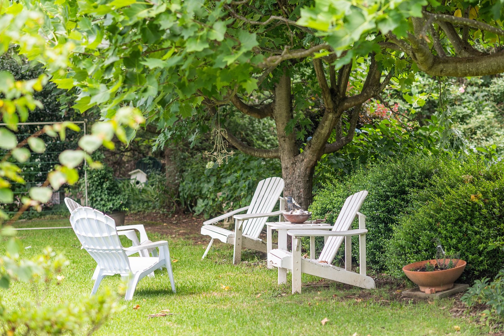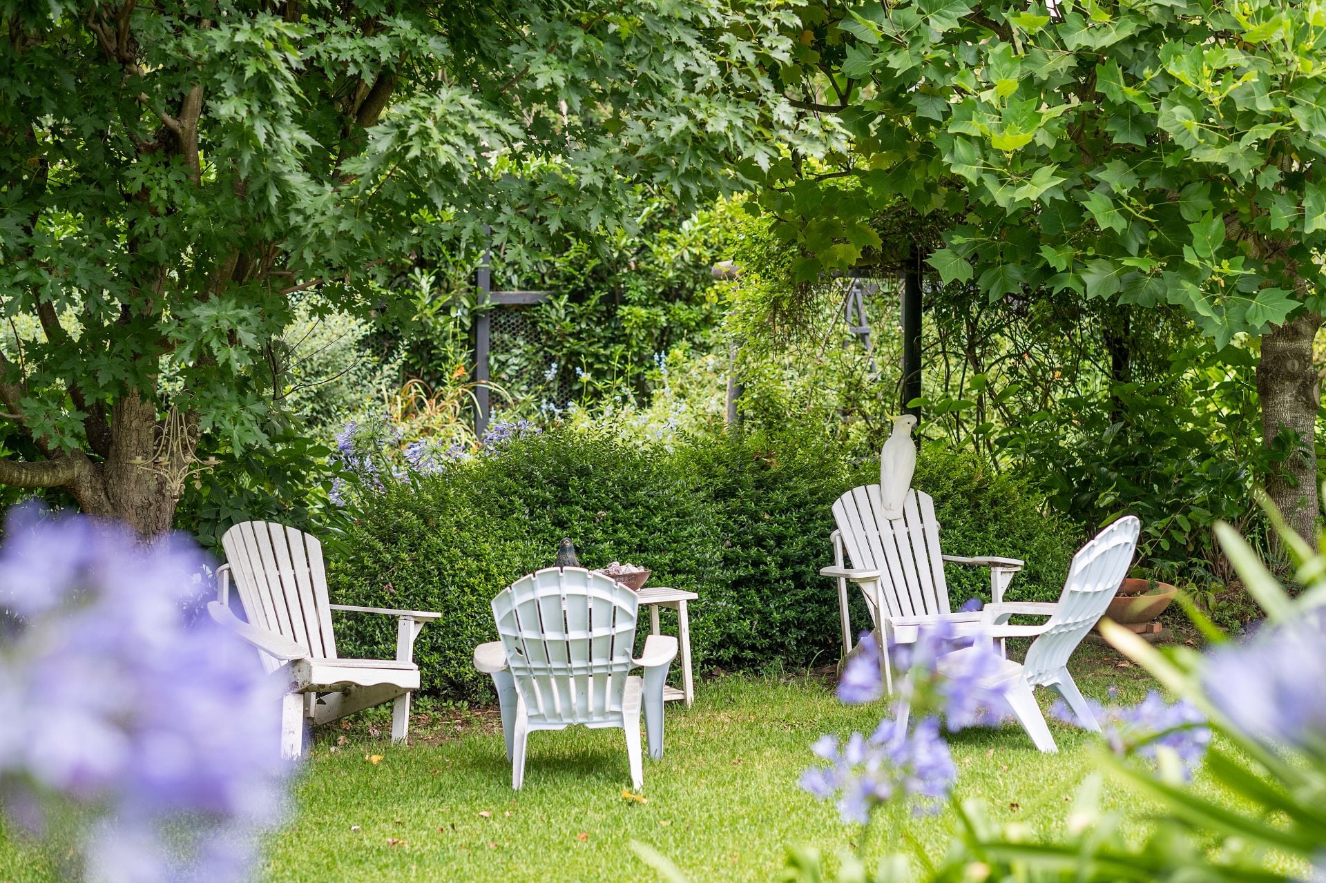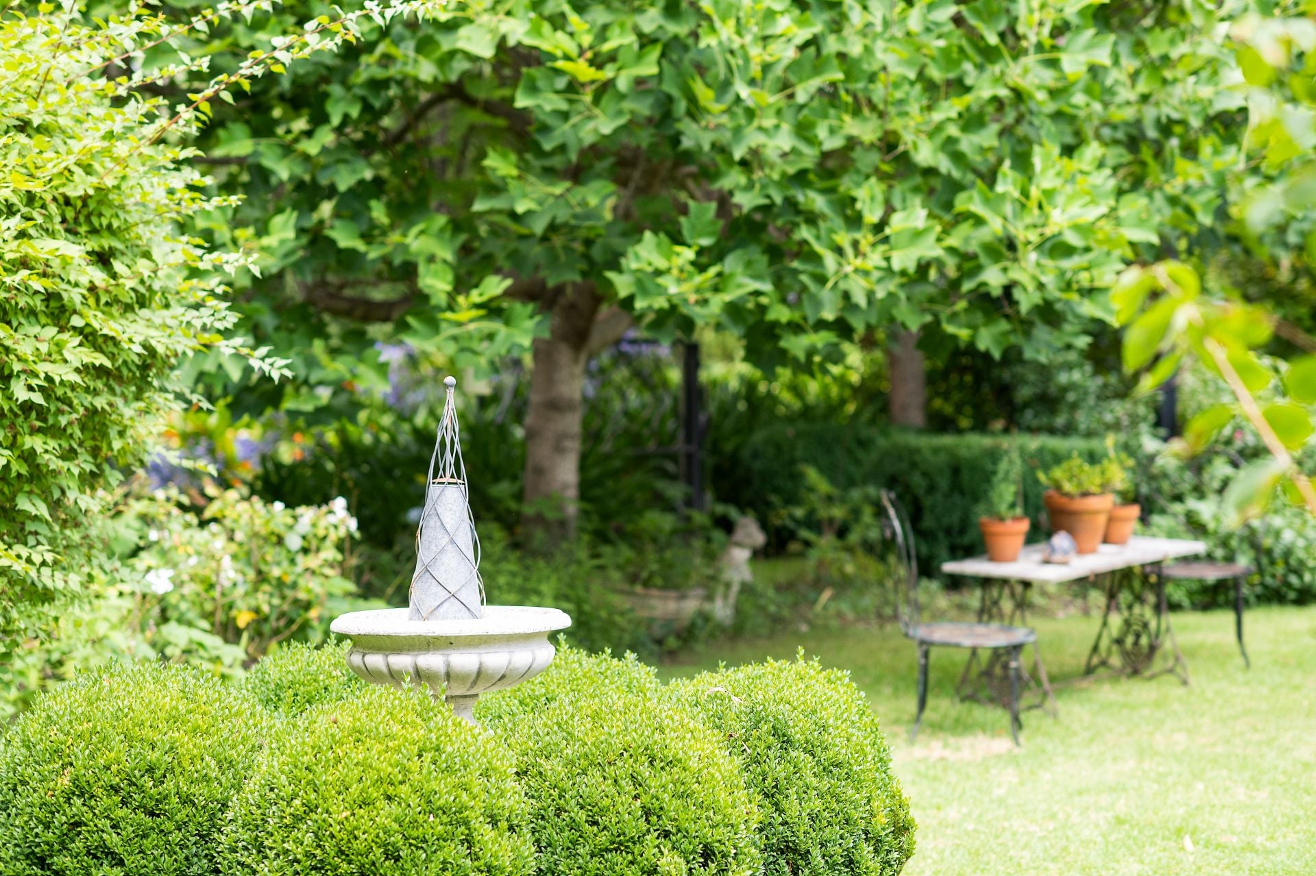 Outdoors, a large, private alfresco entertaining area is surrounded by lush gardens, providing a peaceful setting for gatherings or quiet relaxation.