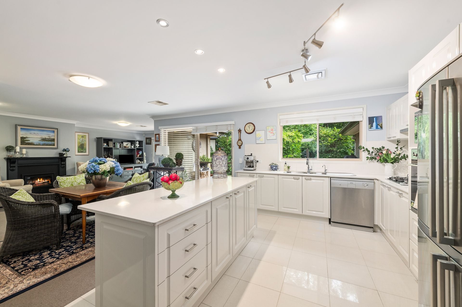 Inside, formal lounge and dining rooms with plantation shutters provide elegant spaces for entertaining, while the heart of the home opens to light-filled, everyday living. The open plan kitchen, breakfast area and family room enjoy a lovely outlook to the gardens and are enhanced by an almost-new gas log fireplace, creating a warm and welcoming atmosphere year-round. The well-appointed kitchen features stone benchtops, an island bench, Smeg wall oven and dishwasher.