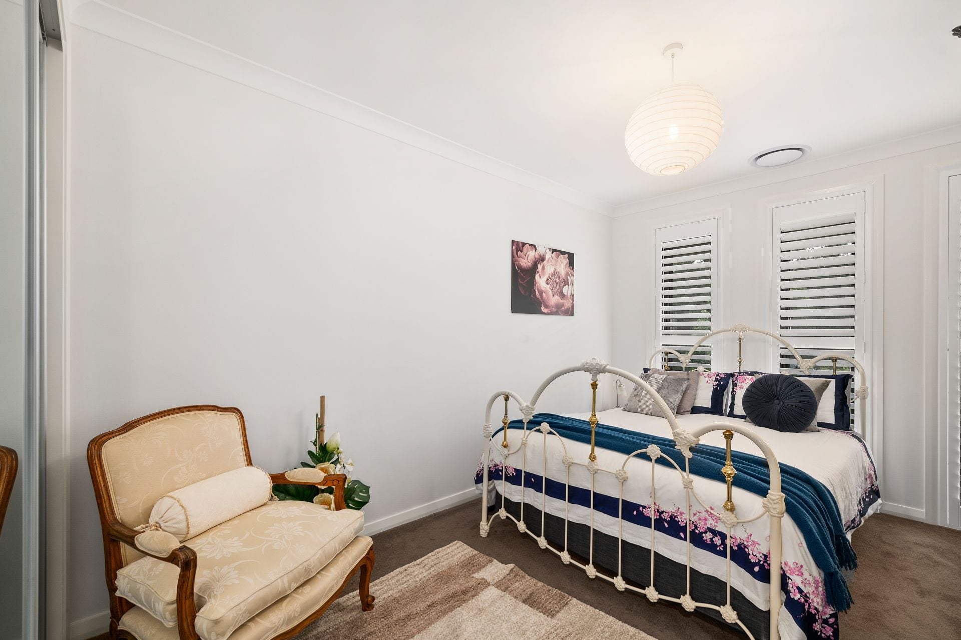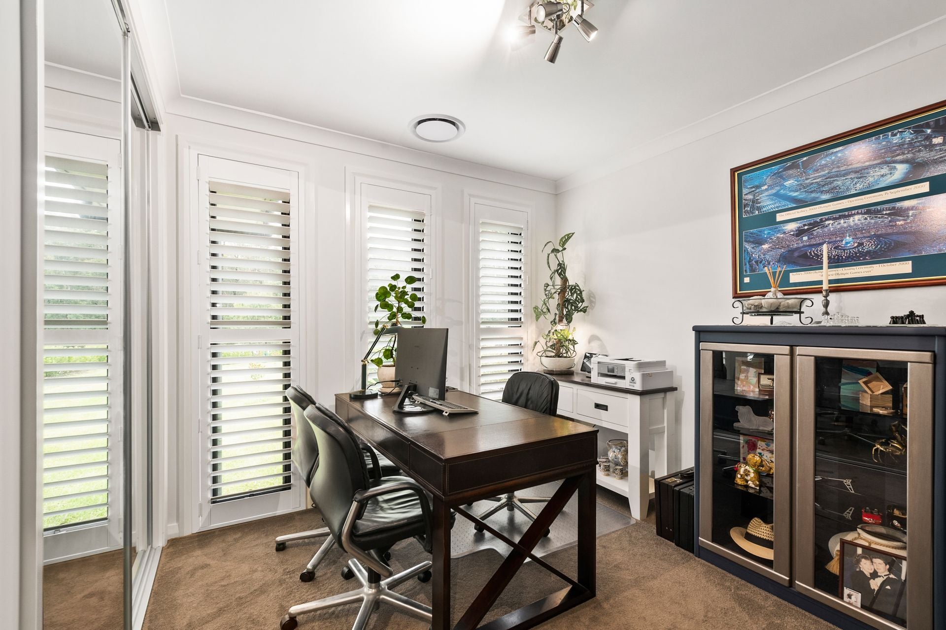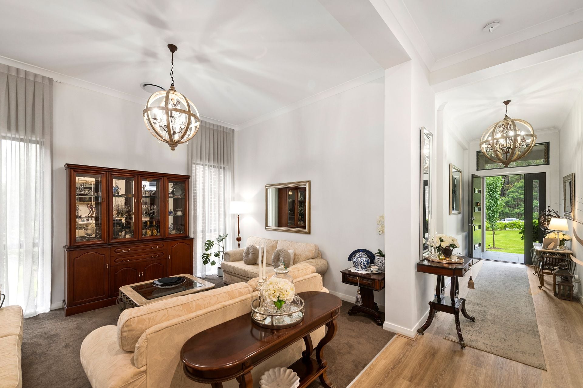 A majestic wide entry hall with soaring 3.3-metre ceilings sets an immediate tone of grandeur, complemented by rich timber flooring and elegant plantation shutters that flow throughout the home.